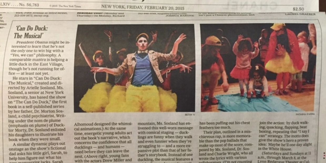 Can Do Duck: The Musical played to sold out audiences at the Lynn Redgrave Theater at the Culture Project in New York City in February and March 2015. It received a rave review in the New York Times!